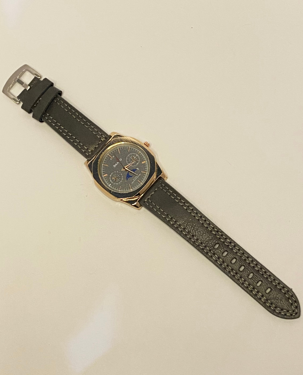 Comes with an original gray leather strap, matching perfectly with the dial.